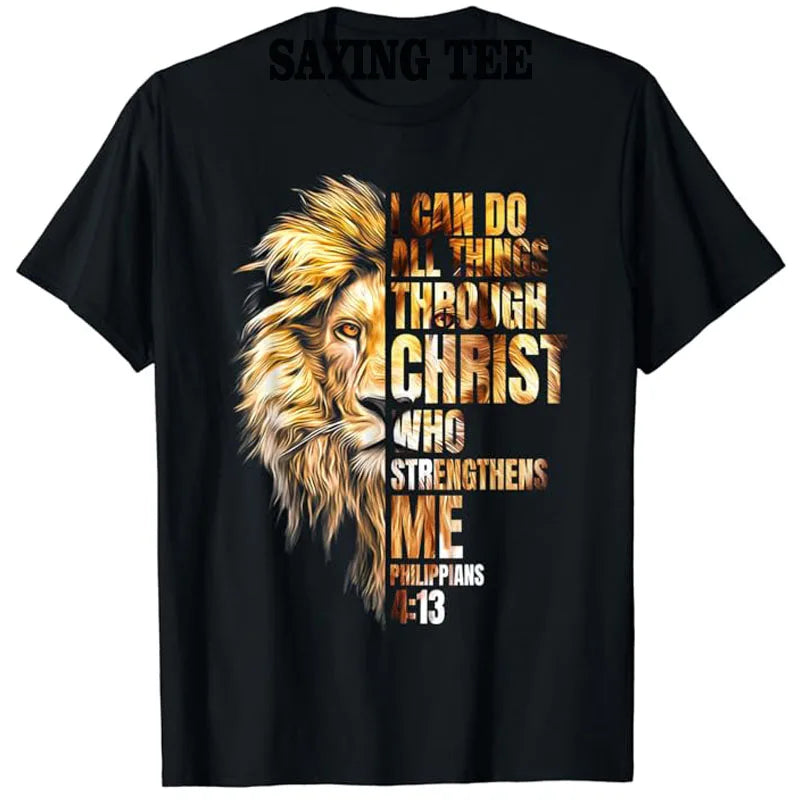 Christian I Can Do All Things Through Christ Lion Faith T-Shirt Lion Lover Graphic Outfits Men's Fashion Christ Faith Saying Tee