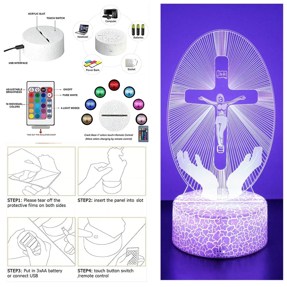 Jesus Cross 3D Lamp Friends Xmas Easter LED Night Light Crucifix Optical Illusion Nightlight Desk Table Lamps Room Decor Gifts